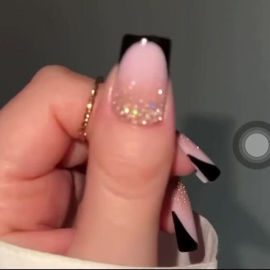 It combines a sophisticated black and nude palette with a festive gold glitter accent. To recreate this look, you’ll need to master a few different techniques: the classic French tip, a vertical "V-cut" French, and a glitter gradient.